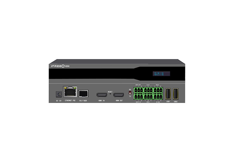 OLED顯示屏,標準H.264/H.265協(xié)議,最高支持4K@60編碼,具有一個千兆網(wǎng)口、一個光纖接口,支持光網(wǎng)雙網(wǎng)絡(luò)熱備份,一個HDMI輸入口、一個HDMI環(huán)出口,一個音頻輸入口、一個音頻輸出口,一個RS-232接口、一個I/O接口,一個IR接口,兩個USB接口,KVM功能。